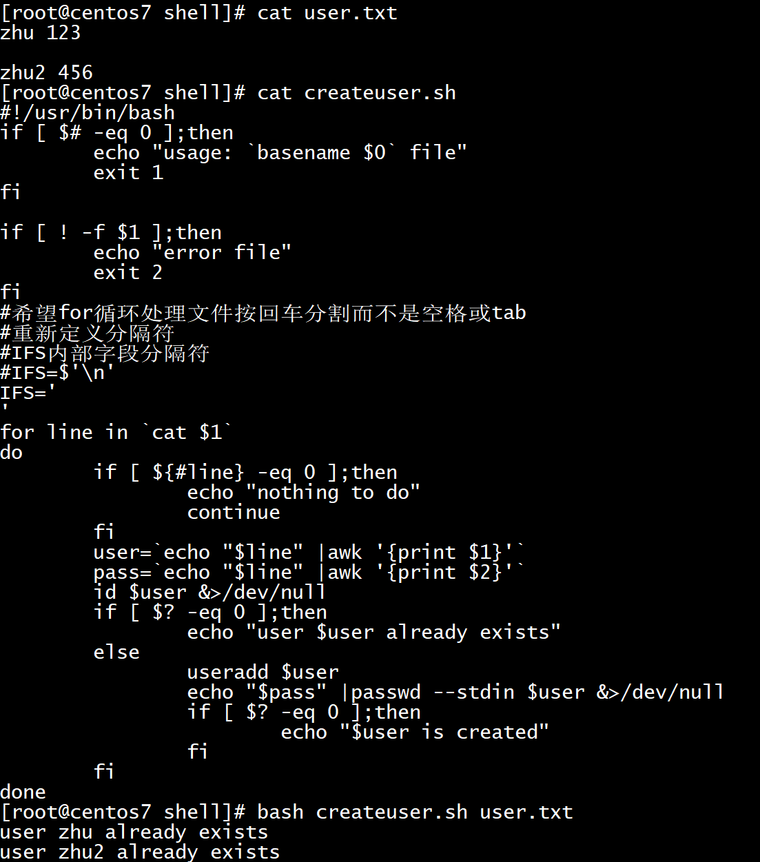 done < user.txteg2:while实现批量用户创建,指定账号密码。
