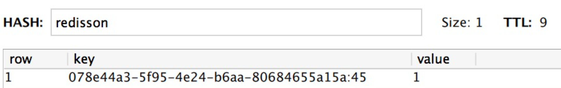 Hash类型相当于java的<key,<key1,value>>类型,这里key是指”redisson”,有效期剩下9秒,key1的值为078e44a3-5f95-4e24-b6aa-80684655a15a:45, 即guid+当前线程的ID,后面的value是就和可重入加锁有关。