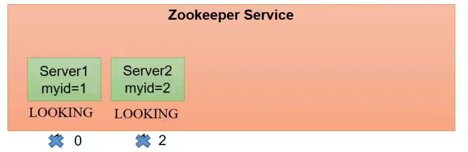 ②服务器2启动,再发起一次选举。服务器1和2分别投自己一票并交换选票信息:此时服务器1发现服务器2的myid比自己目前投票推举的(服务器1)大,更改选票为推举服务器2。此时服务器1票数0票,服务器2票数2票,没有半数以上结果,选举无法完成,服务器1,2状态保持LOOKING。