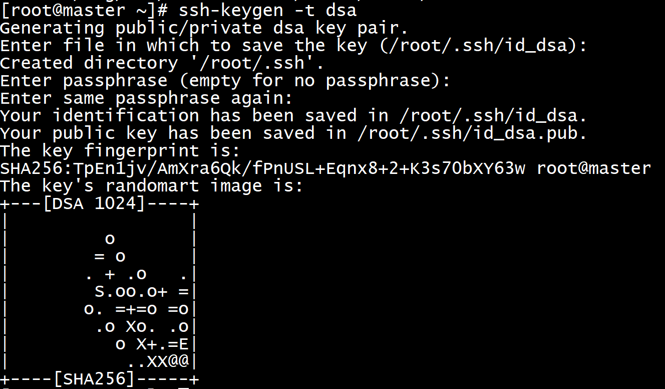 ①分别在三台主机执行以下命令在/root/.ssh文件夹下生成id_dsa(私钥)和id_dsa.pub(公钥)文件(在命令执行过程中敲击两遍回车)。