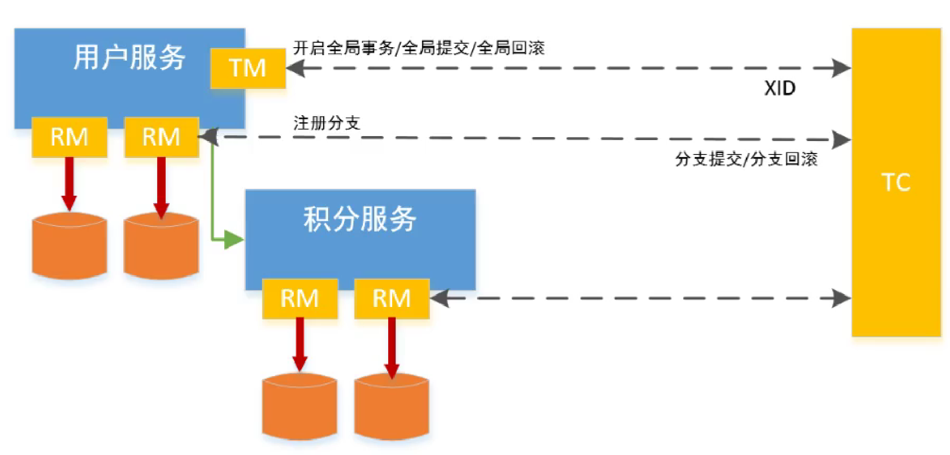 以注册送积分为例来说明,共有两个微服务交互,用户服务和积分服务,用户服务负责添加用户,积分服务负责增加积分。
