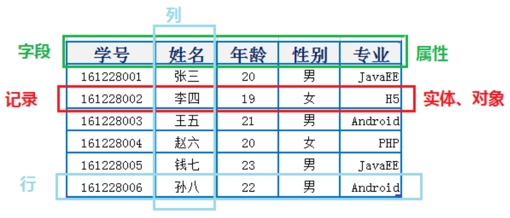 关系型数据库以行(row) 和 列(column)的形式存储数据,以便于用户理解。这一系列的行和列被称为表(table),一组表组成了一个库(database)。