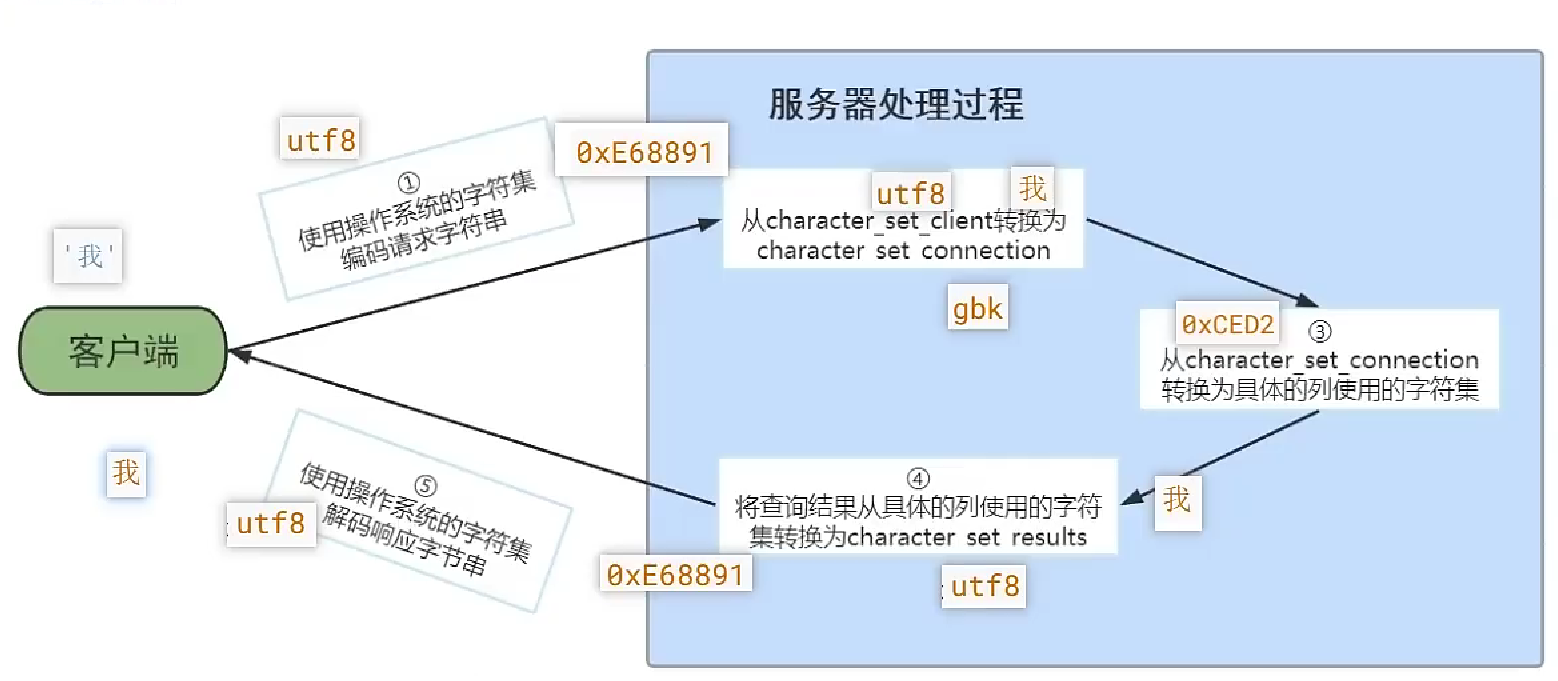 ②服务器接收到客户端发送来的请求其实是一串二进制的字节,它会认为这串字节采用的字符集是 character_set_client,然后把这串字节转换为character_set_connection字符集编码的字符。