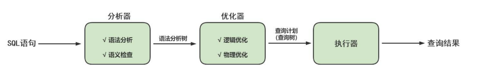 客户端进程向服务器进程发送一段文本(SQL语句),服务器进程处理后再向客户端进程发送一段文本(处理结果)。那服务器进程对客户端进程发送的请求做了什么处理,才能产生最后的处理结果呢?这里以查询请求为例展示: