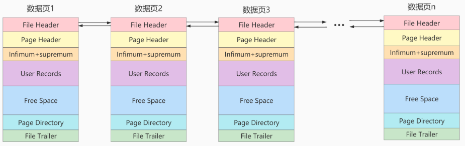 FIL_PAGE_PREV和FIL_PAGE_NEXT就分别代表本页的上一个和下一个页的页号。这样通过建立一个双向链表把许许多多的页就都串联起来了,保证这些页之间不需要是物理上的连续,而是逻辑上的连续。