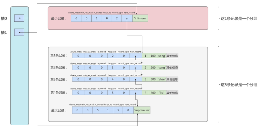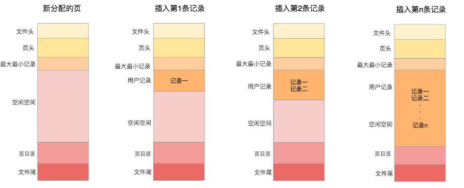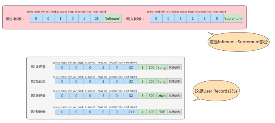 第二个部分是记录部分,页的主要作用是存储记录,所以“最大和最小记录”和“用户记录”部分占了页结构的主要空间。