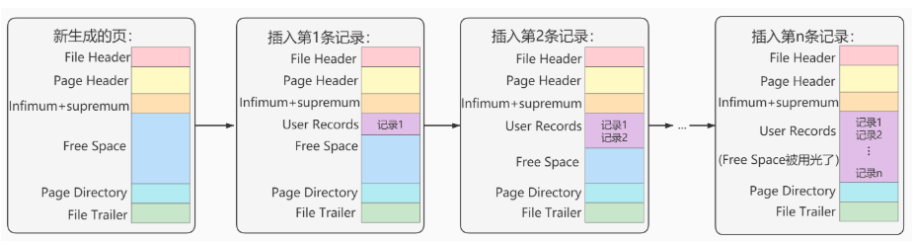 行格式存储到User Records部分。但是在一开始生成页的时候,其实并没有User Records这个部分,每当我们插入一条记录,都会从Free Space部分,也就是尚未使用的存储空间中申请一个记录大小的空间划分到User Records部分,当Free Space部分的空间全部被User Records部分替代掉之后,也就意味着这个页使用完了,如果还有新的记录插入的话,就需要去申请新的页了。![]()