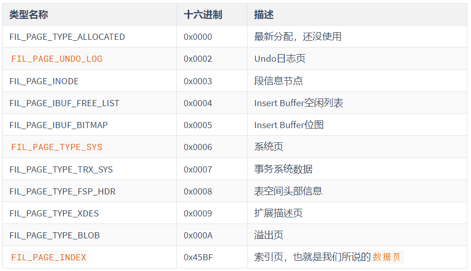 FIL_PAGE_OFFSET:每一个页都有一个单独的页号,就跟你的身份证号码一样,InnoDB通过页号可以唯一定位一个页。FIL_PAGE_TYPE:这个代表当前页的类型。InnoDB为了不同的目的而把页分为不同的类型,我们上边介绍的其实都是存储记录的数据页,其实还有很多别的类型的页,具体如下: