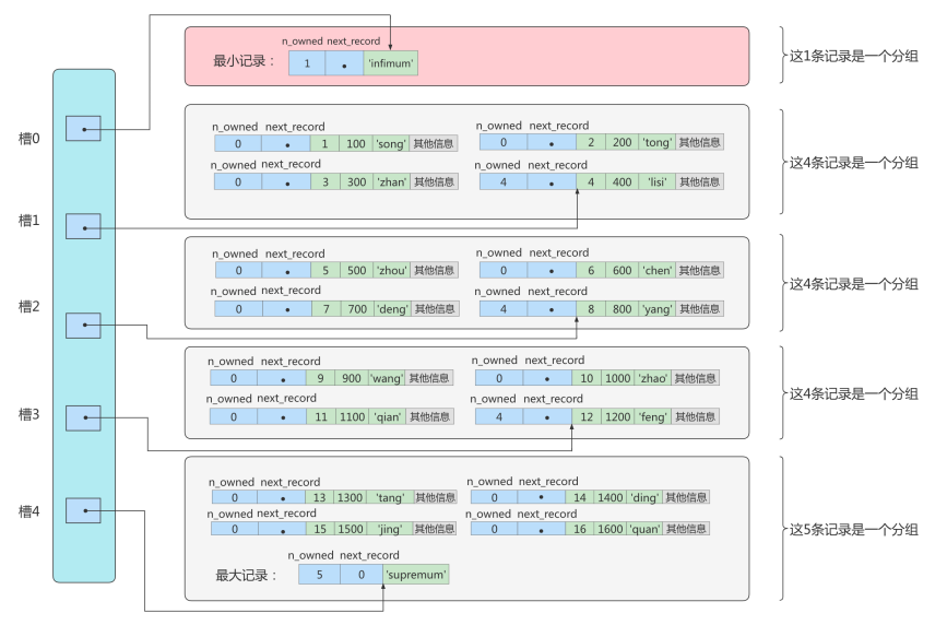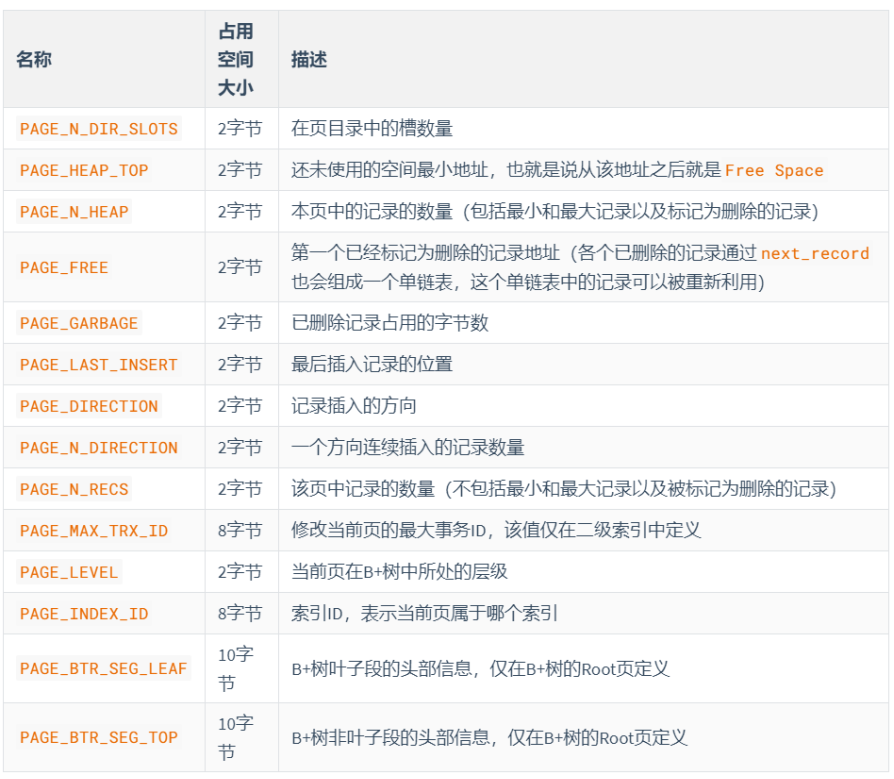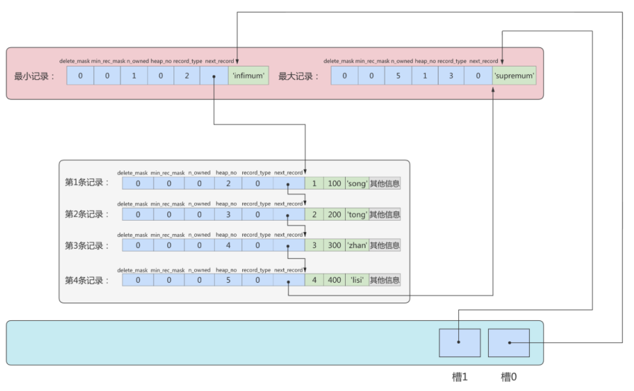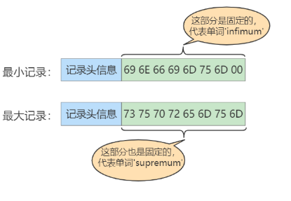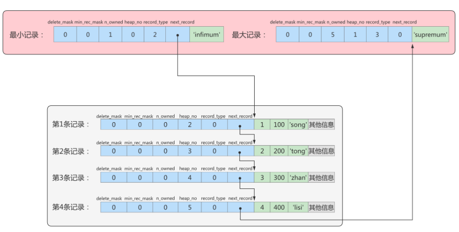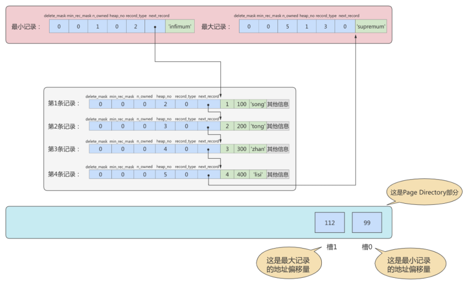 第二个部分是记录部分,页的主要作用是存储记录,所以“最大和最小记录”和“用户记录”部分占了页结构的主要空间。