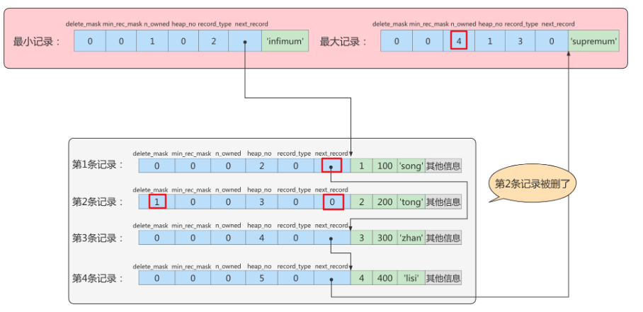 重新排列,导致性能消耗。所以只是打一个删除标记而已,所有被删除掉的记录都会组成一个所谓的垃圾链表,在这个链表中的记录占用的空间称之为可重用空间,之后如果有新记录插入到表中的话,可能把这些被删除的记录占用的存储空间覆盖掉。