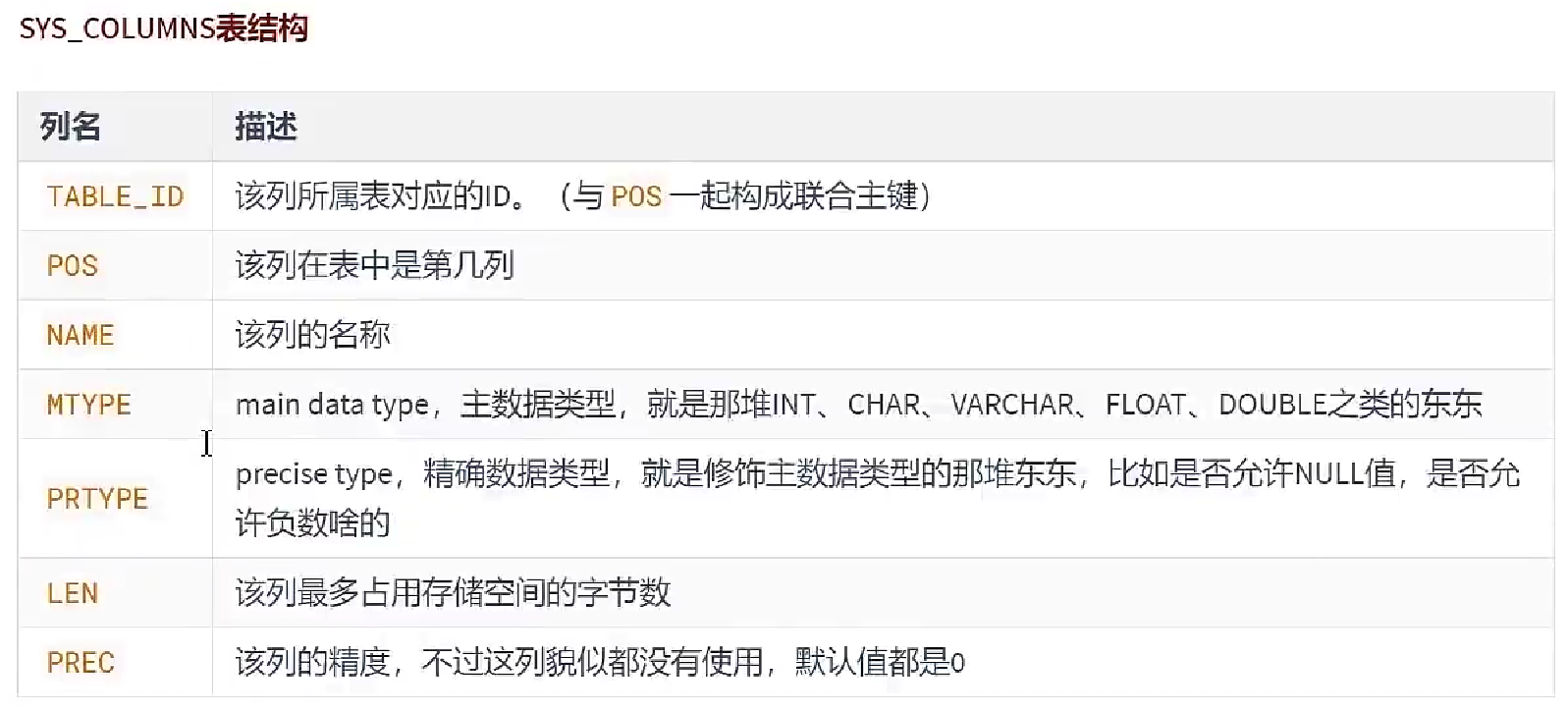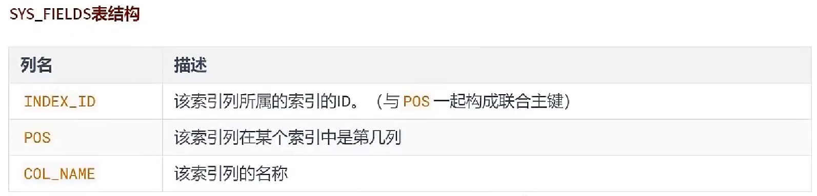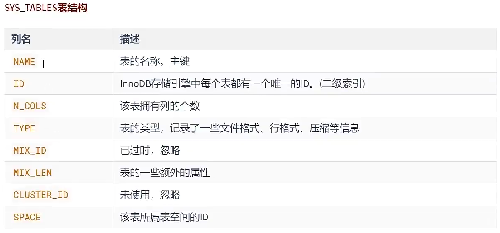 数据字典,它们都是以B+树的形式保存在系统表空间的某些页面中,其中SYS_TABLES、SYS_COLUNNS、SYS_INDEXES、SYS_FIELDS这四个表尤其重要,称之为基本系统表(basic system tables) ,我们先看看这四个表的结构: