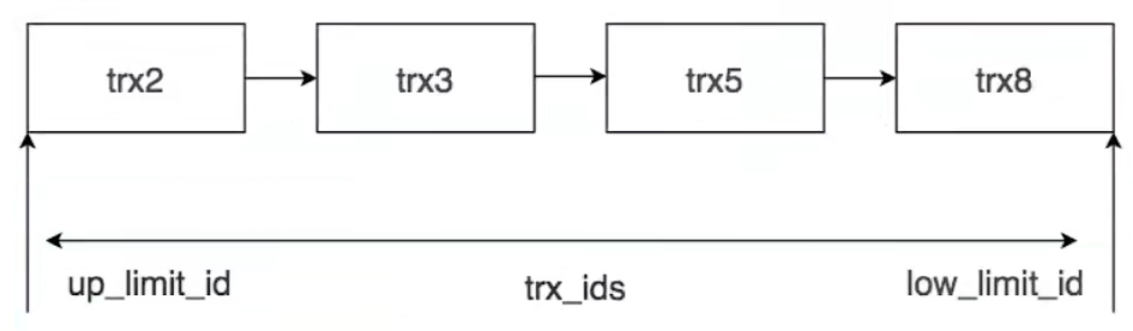 举例:trx_ids为trx2、trx3、trx5和trx8的集合,系统的最大事务ID (low_limit_id)为trx8+1(如果之前没有其他的新增事务),活跃的最小事务ID(up_limit_id)为trx2。