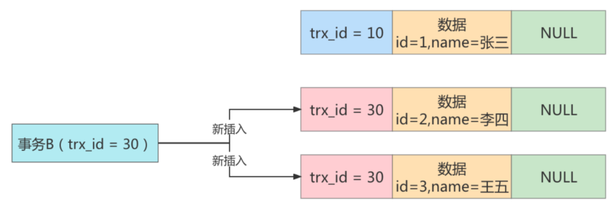 步骤2:接着事务B(trx_id=30),往表student中新插入两条数据,并提交事务。