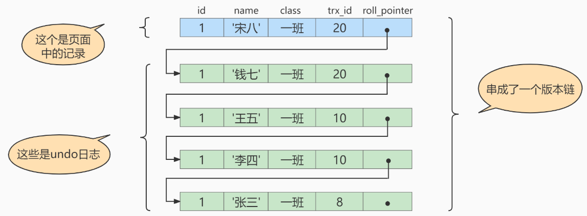 roll_pointer属性(INSERT操作对应的undo日志没有该属性,因为该记录并没有更早的版本),可以将这些undo日志都连起来,串成一个链表: