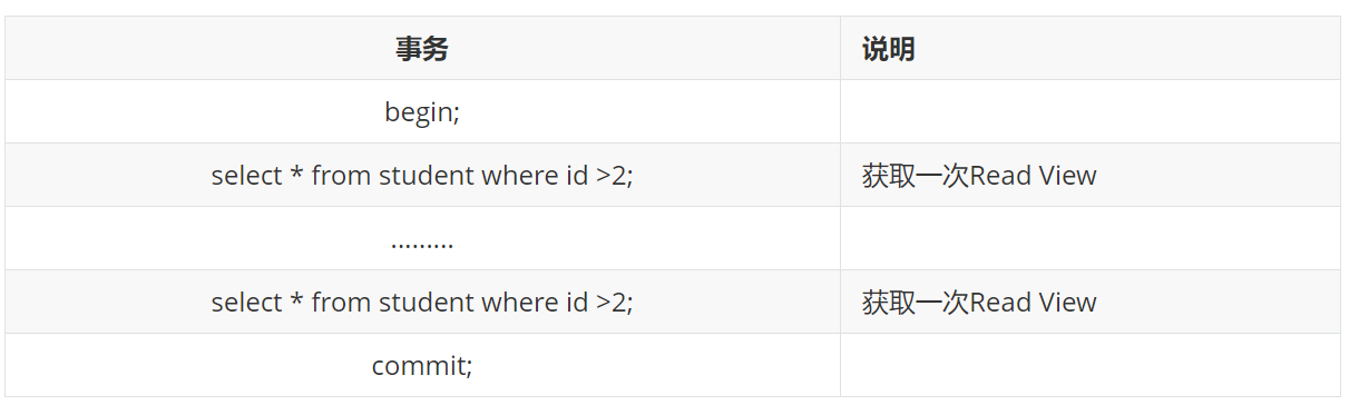 在隔离级别为读已提交(Read Committed)时,一个事务中的每一次SELECT查询都会重新获取一次Read View。