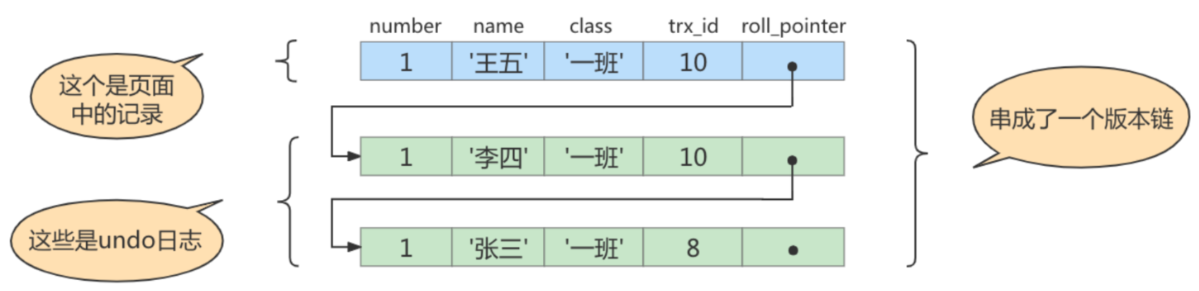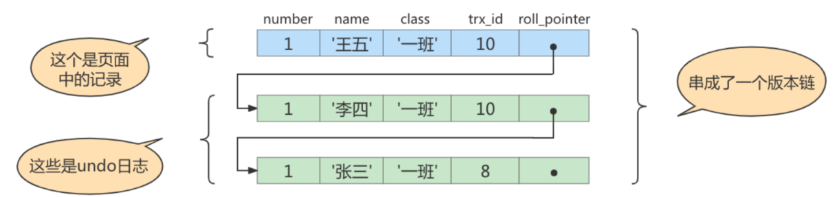 undo日志中,就算是该记录的一个旧版本,随着更新次数的增多,所有的版本都会被roll_pointer属性连接成一个链表,我们把这个链表称之为版本链,版本链的头节点就是当前记录最新的值。每个版本中还包含生成该版本时对应的