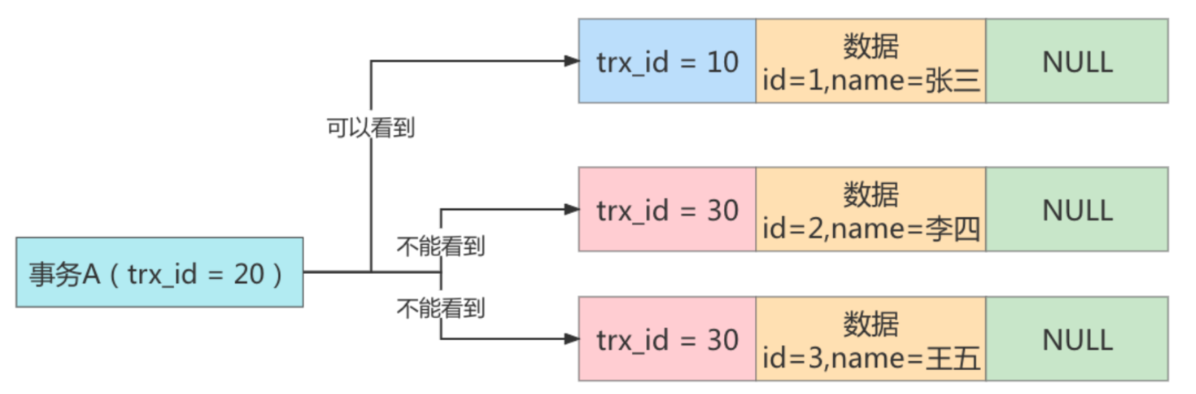 - 同理,id=3的这条数据,trx_id也为30,因此也不能被事务A看见。
