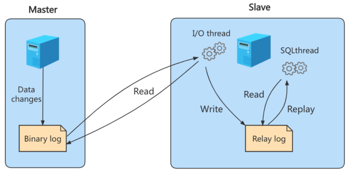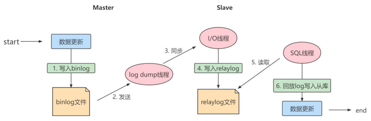 二进制日志转储线程发送的 Binlog 更新部分,并且拷贝到本地的中继日志 (Relay log)。从库 SQL 线程会读取从库中的中继日志,并且执行日志中的事件,将从库中的数据与主库保持同步。