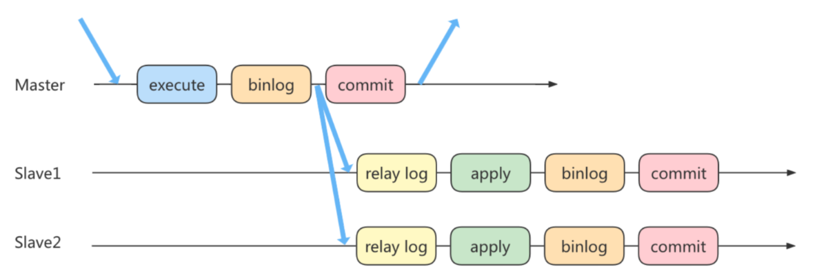 Slave重做中继日志中的事件,将改变应用到自己的数据库中。 MySQL复制是异步的且串行化