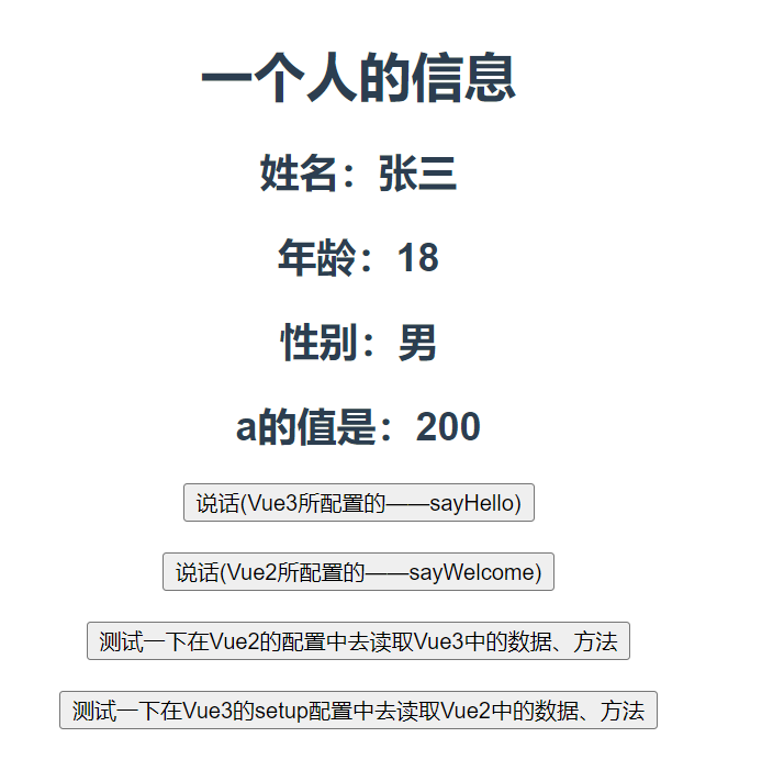 - Vue2.x配置(data、methos、computed…)中可以访问到setup中的属性、方法。