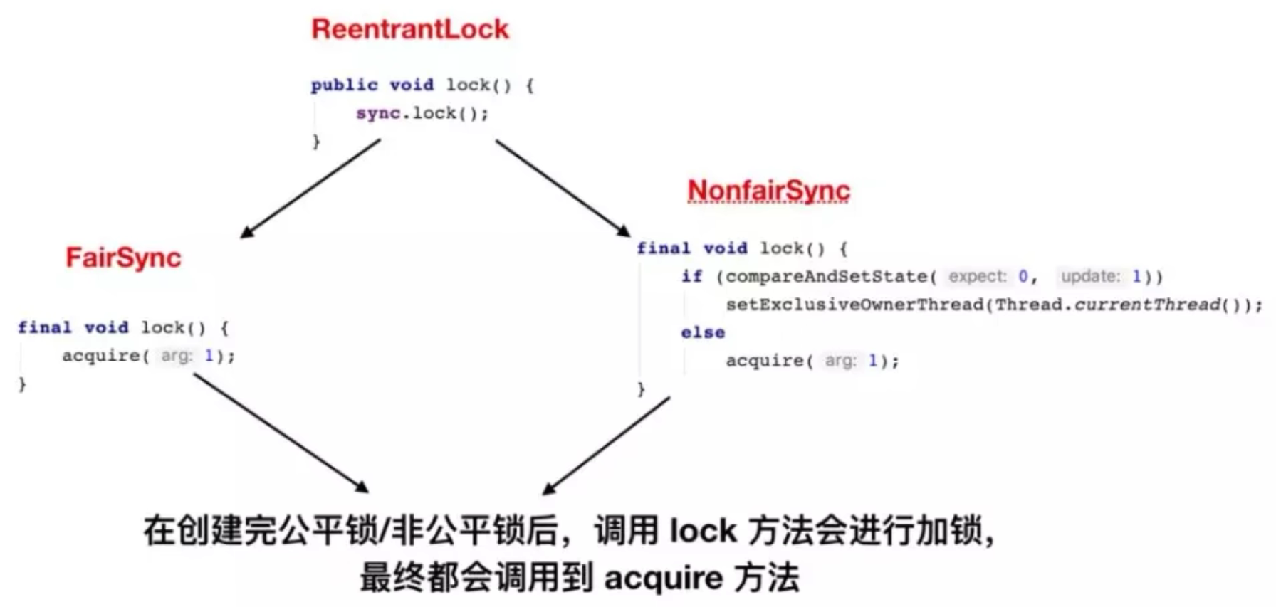 对比公平锁和非公平锁的tryAcquire()方法的实现代码,其实差别就在于非公平锁获取锁时比公平锁中少了一个判断!hasQueuedPredecessors()。