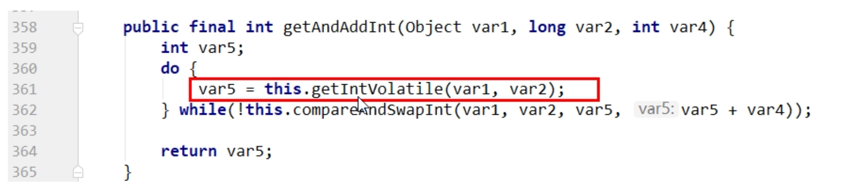 我们可以看到getAndAddlnt方法执行时,有个do while。