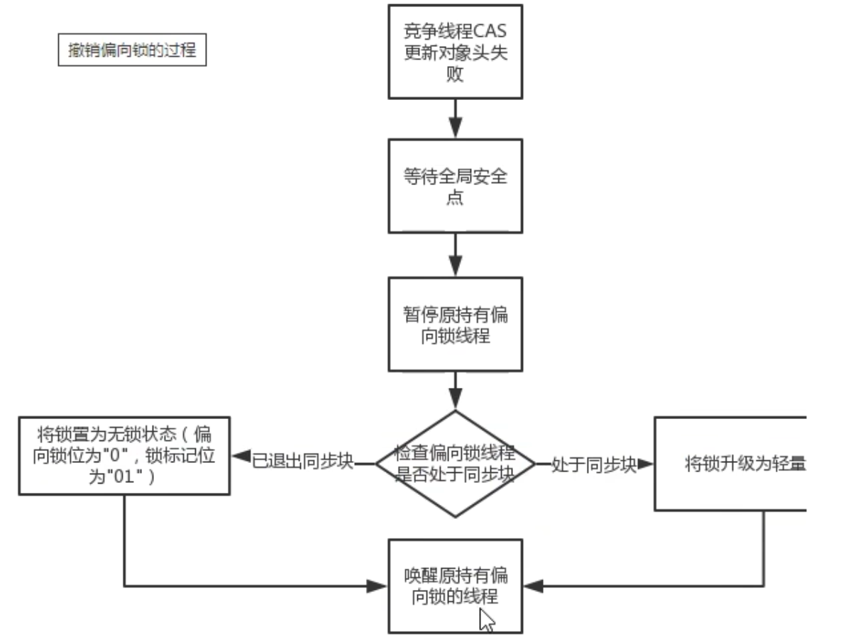 偏向锁使用一种等到竞争出现才释放锁的机制,只有当其他线程竞争锁时,持有偏向锁的原来线程才会被撤销。撤销需要等待全局安全点(该时间点上没有字节码正在执行),同时检查持有偏向锁的线程是否还在执行: