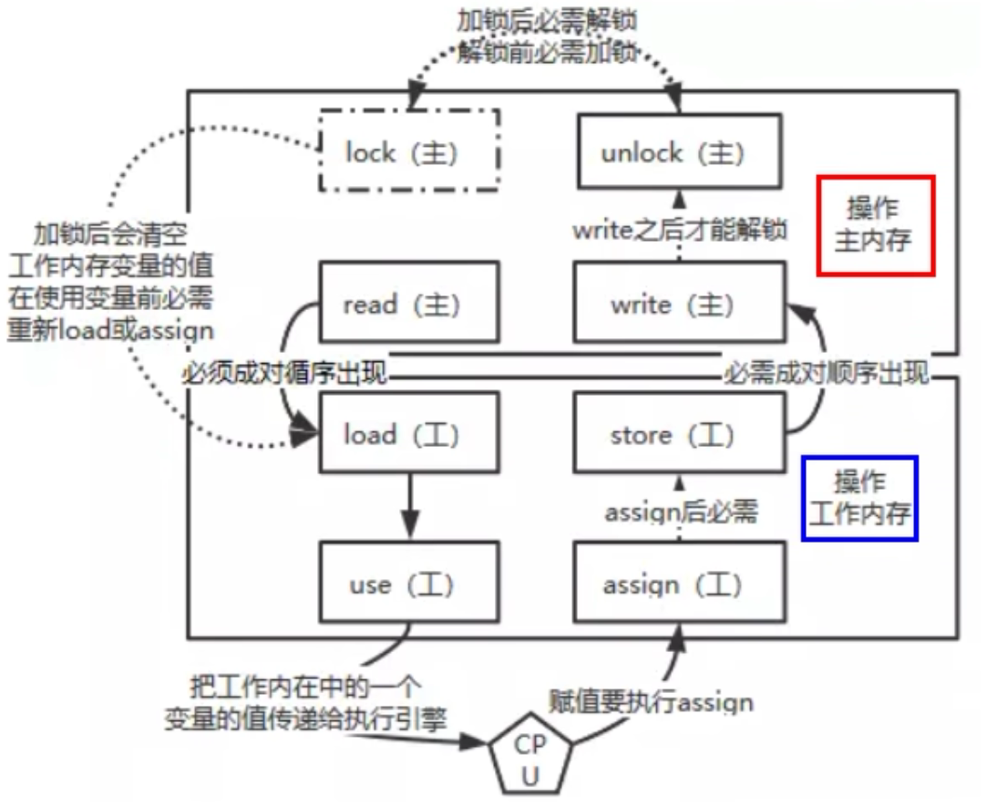 - write:作用于主内存,将store传输过来的变量值赋值给主内存中的变量。