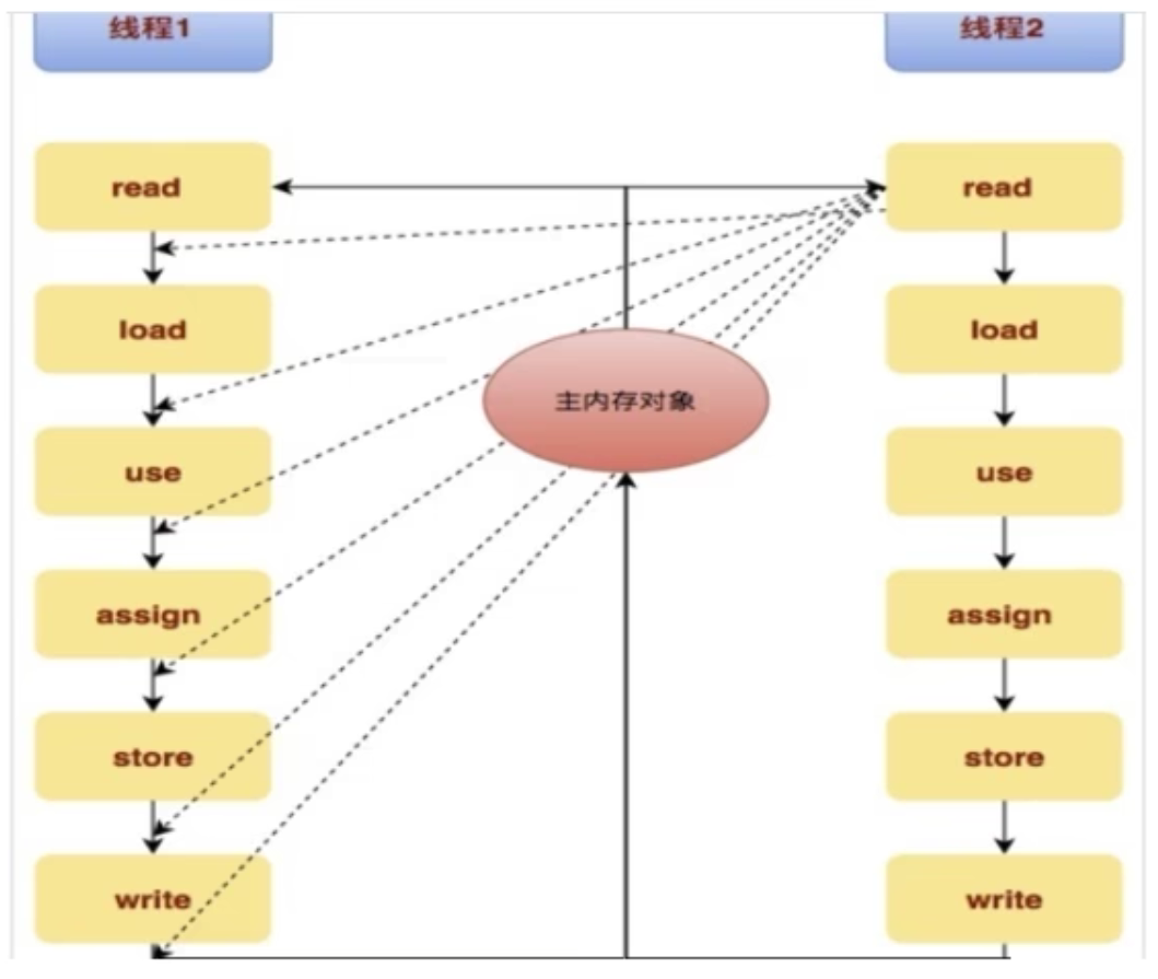 当线程1对主内存对象发起read操作到write操作第一套流程的时间里,线程2随时都有可能对这个主内存对象发起第二套操作。