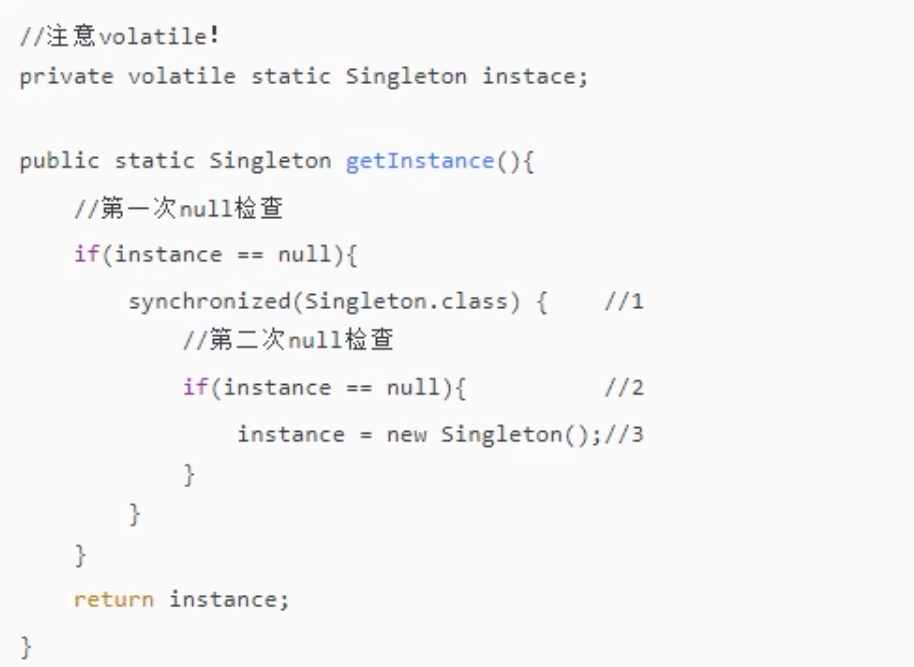 隐患:多线程环境下,在”问题代码处”,会执行如下操作,由于重排序导致2,3乱序,后果就是其他线程得到的是null而不是完成初始化的对象。