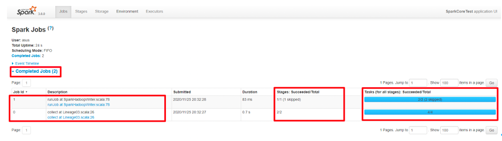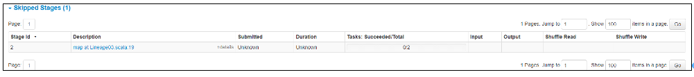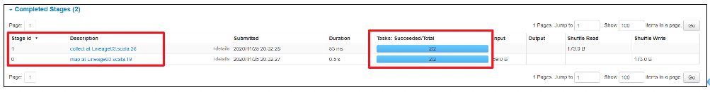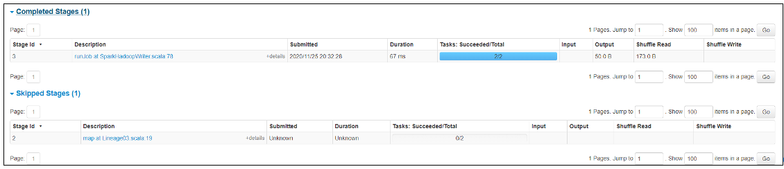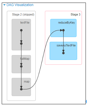 查看前面2.7.4依赖关系代码的DAG图。访问http://localhost:4040/jobs/页面,查看第一个和第二个job的DAG图。说明:增加缓存后血缘依赖关系仍然有,但是,第二个job取的数据是从缓存中取的。