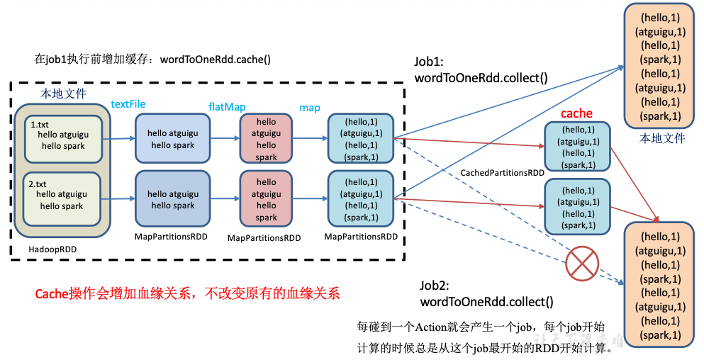- 第1个job执行完,数据就保存到Cache里面了,第2个job运行checkpoint,直接读取Cache里面的数据,并把数据存储在检查点上。第3、4个job,数据从检查点上直接读取。