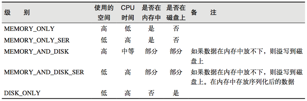 val OFF_HEAP = new StorageLevel(true, true, true, false, 1)注意:默认的存储级别都是仅在内存存储一份。在存储级别的末尾加上“_2”表示持久化的数据存为两份。SER:表示序列化。