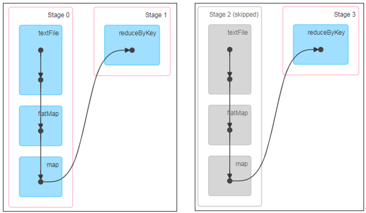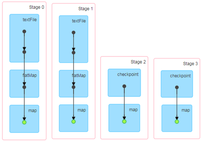- 第1个job执行完,触发了checkpoint,第2个job运行checkpoint,并把数据存储在检查点上。第3、4个job,数据从检查点上直接读取。