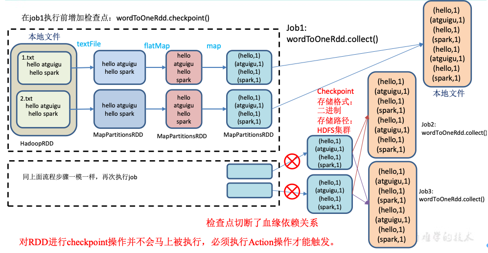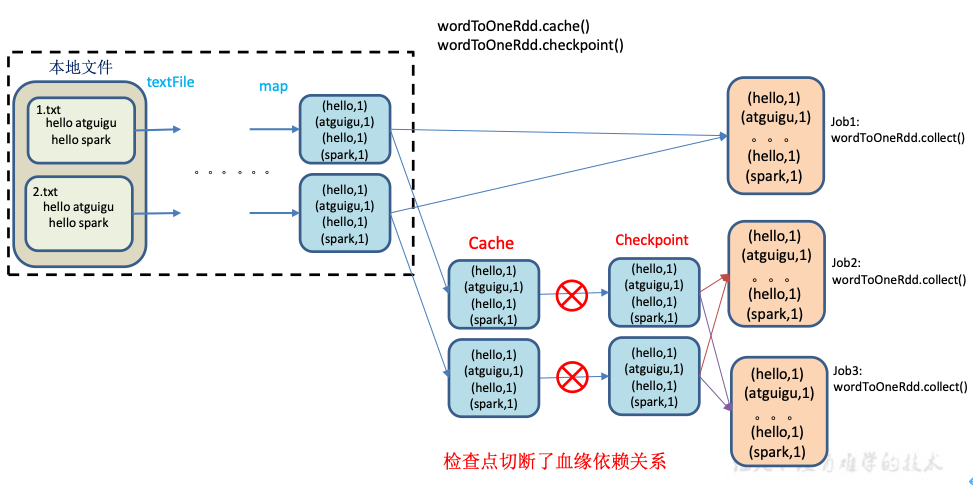 检查点切断血缘:在Checkpoint的过程中,该RDD的所有依赖于父RDD中的信息将全部被移除。