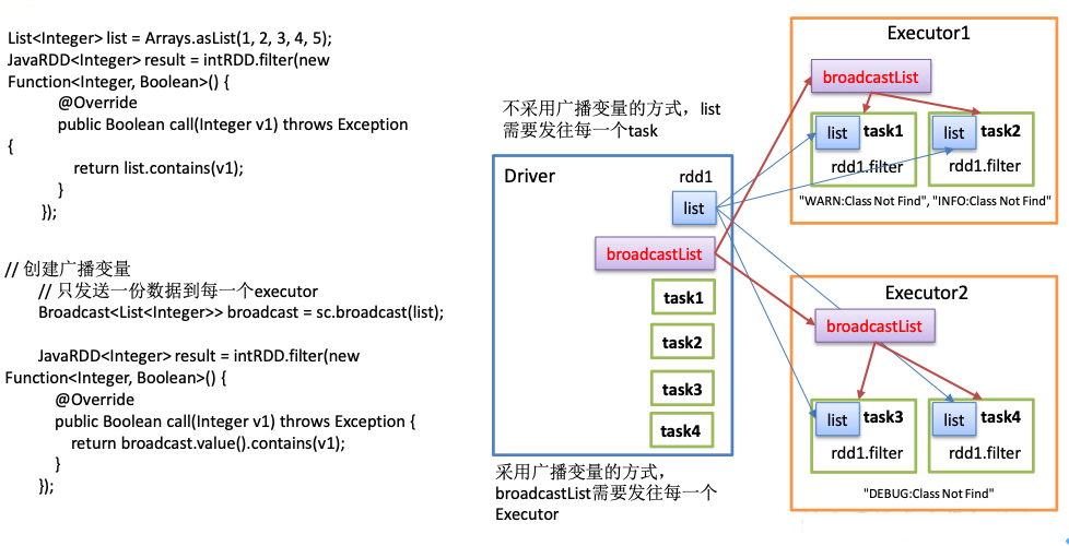 - 调用SparkContext.broadcast(广播变量)创建出一个广播对象,任何可序列化的类型都可以这么实现。