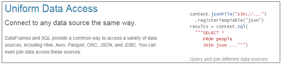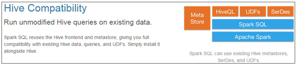 兼容Hive。在已有的仓库上直接运行SQL或者HQL。