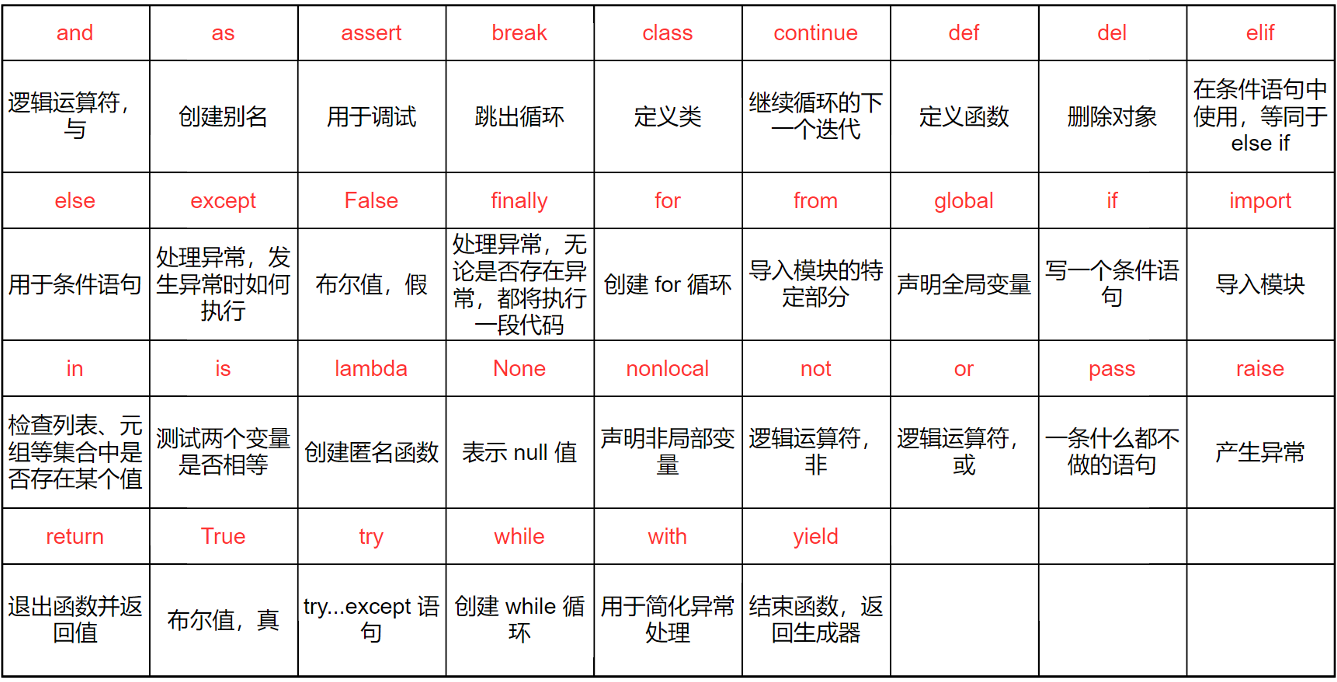 关键字:Python 有一组关键字,这些关键字不能用作变量名、函数名或任何其他标识符。