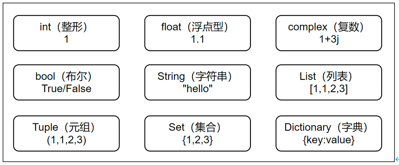 - 基本数据类型:整数(int)、浮点数(float)、复数(complex)、布尔(bool)