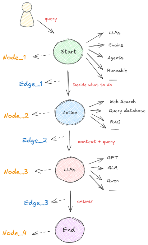 在启动点定义的可运行功能会根据收到的输入决定是否进行检索以及如何响应。比如在执行过程中,如果需要检索信息,则可以利用搜索工具来实现,比如Web Search(网络搜索)、Query Database(查询数据库)、RAG等获取必要的信息(图中的 “Action” 圆圈)。接下来,再使用一个大语言模型(LLM)处理工具提供的信息,结合用户最初传入的初始查询,生成最终的响应(图中的 “LLMs” 圆圈)。最终,这个响应被传递至终点节点(图中的 “End” 圆圈)。