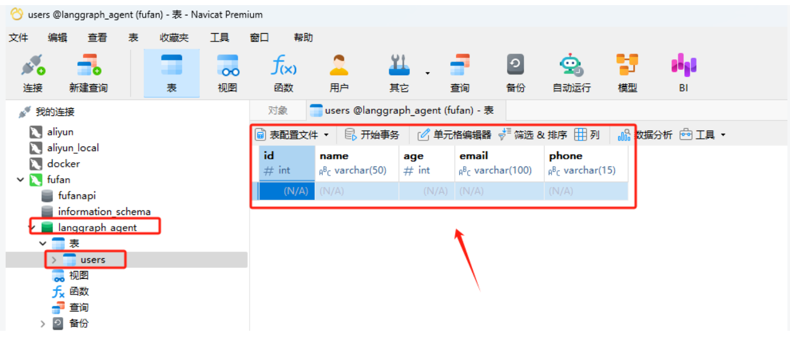 如果Mysql服务正常且连接信息填写正确,将会在langgraph_agent数据库中创建出一个User表,如下所示:(下图软件为Navicate,大家可自行下载,下载链接 👉 https://www.navicat.com/en/download/navicat-premium)