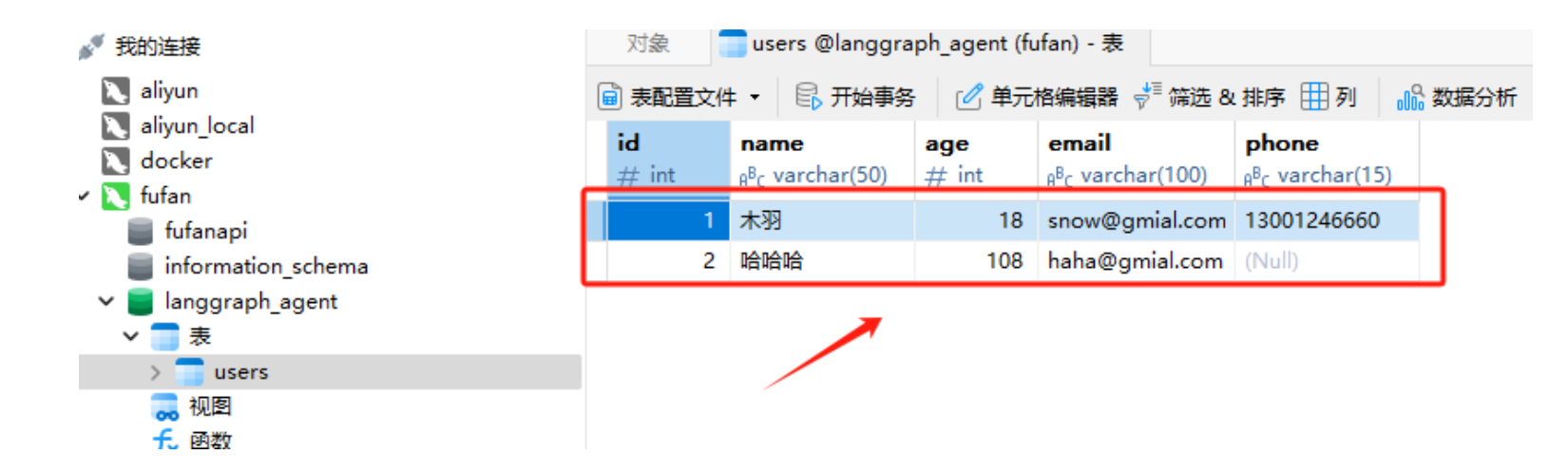 1 2 3 4 5 6 7 8 9 10 11 12 13 14 15 16 17 18 19 20 21 22 23 24 25 26 27 28 29 30 31 32 from sqlalchemy import create_engine, Table, Column, Integer, String, MetaDatafrom sqlalchemy.orm import declarative_base, sessionmaker from sqlalchemy.orm import sessionmakerBase = declarative_base() class User (Base ): __tablename__ = 'users' id = Column(Integer, primary_key=True ) name = Column(String(50 )) age = Column(Integer) email = Column(String(100 )) phone = Column(String(15 )) DATABASE_URI = 'mysql+pymysql://root:[email protected] /langgraph_agent?charset=utf8mb4' engine = create_engine(DATABASE_URI, echo=True ) Base.metadata.create_all(engine) Session = sessionmaker(bind=engine) session = Session()