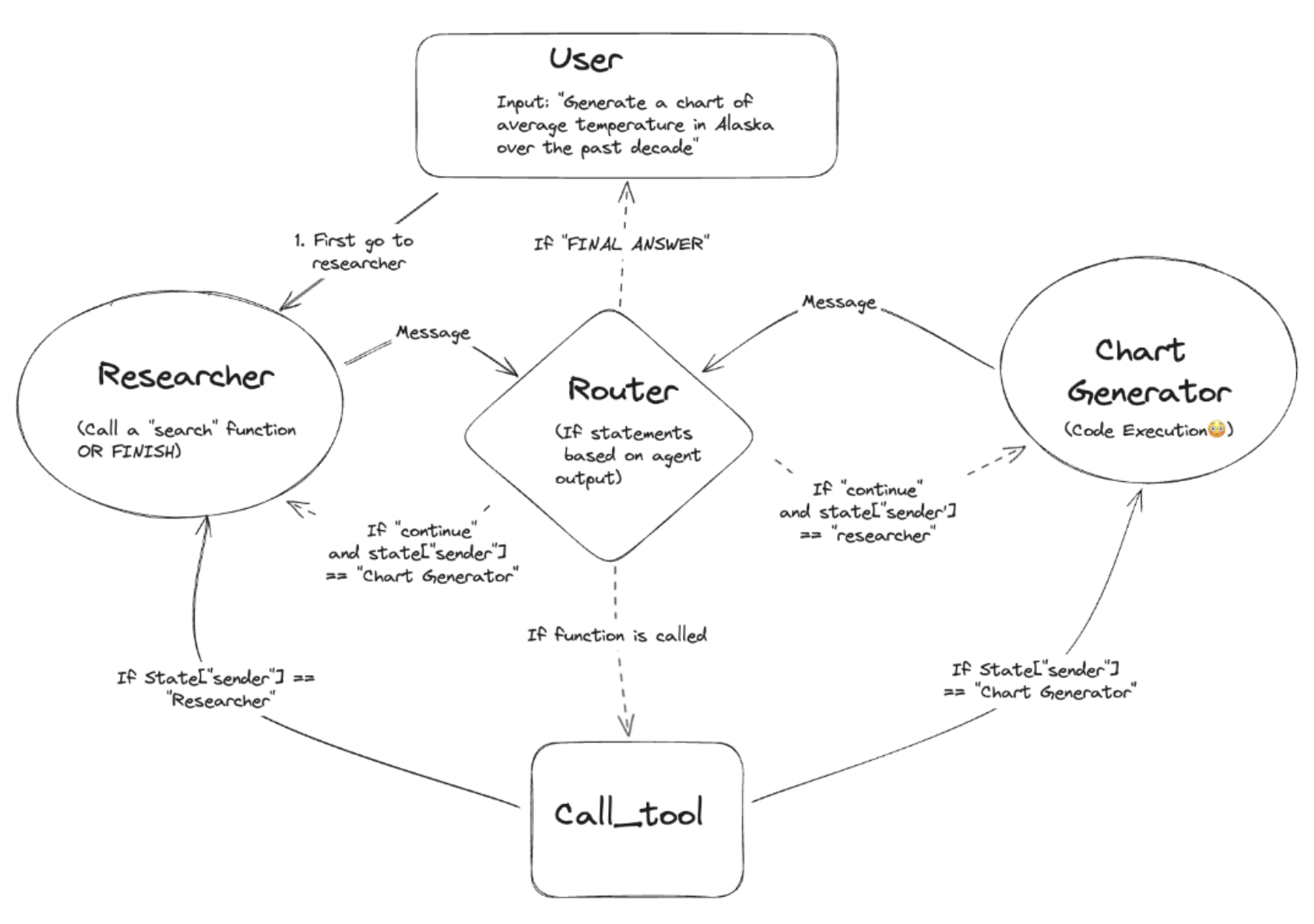 LangGraph 非常适合创建多代理工作流,因为它允许将两个或多个代理作为图连接。每个代理都是一个独立的参与者,代理之间的连接由边表示。每个连接边都可以有一个控制条件,用于将信息从一个代理中引导到另一个代理中,并且每个代理都有一个状态,可以在每个流期间使用信息进行更新。