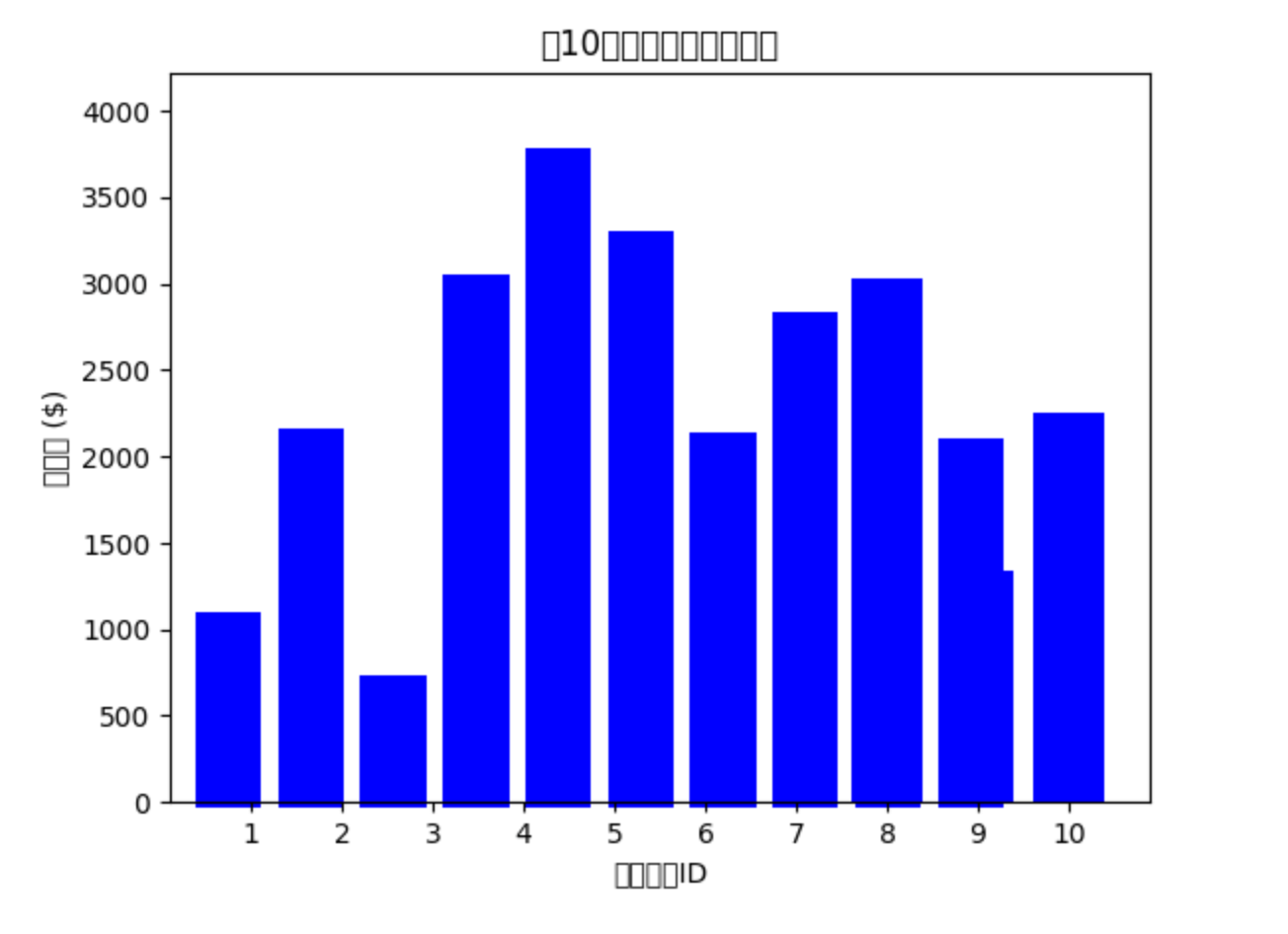 帮我根据前10名的 销售记录id,生成对应的销售额柱状图